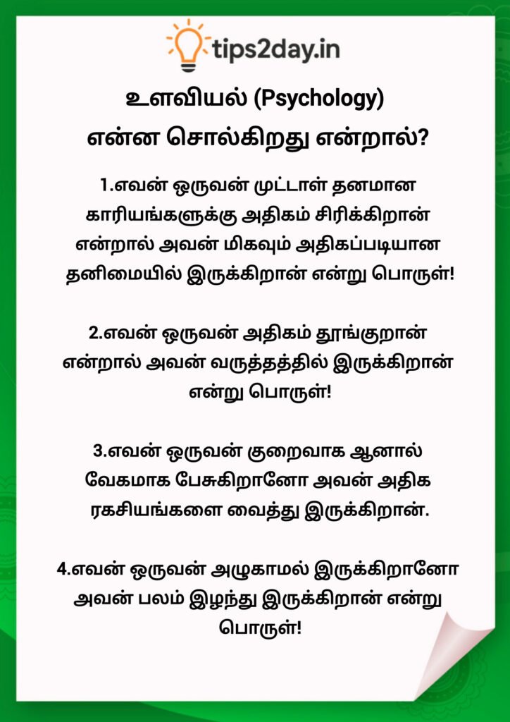அழகு பராமரிப்பு ஆரோக்கியம் தலையங்கம்உளவியல் (Psychology) என்ன சொல்கிறது? | Psychology in Tamil thirukumarbfa@gmail.com7 months ago7 months ago01 mins Post navigation Previous: நீங்கள் யாரிடமும் பகிரக்கூடாத 5 ரகசியங்கள்Next: காய்கறிகள் மற்றும் பழங்களின் அற்புதமான பயன்கள் | Vegetables & Fruits Benefits in Tamil Leave a Reply Cancel replyYour email address will not be published. Required fields are marked *Comment * Name * Email * Website Save my name, email, and website in this browser for the next time I comment.